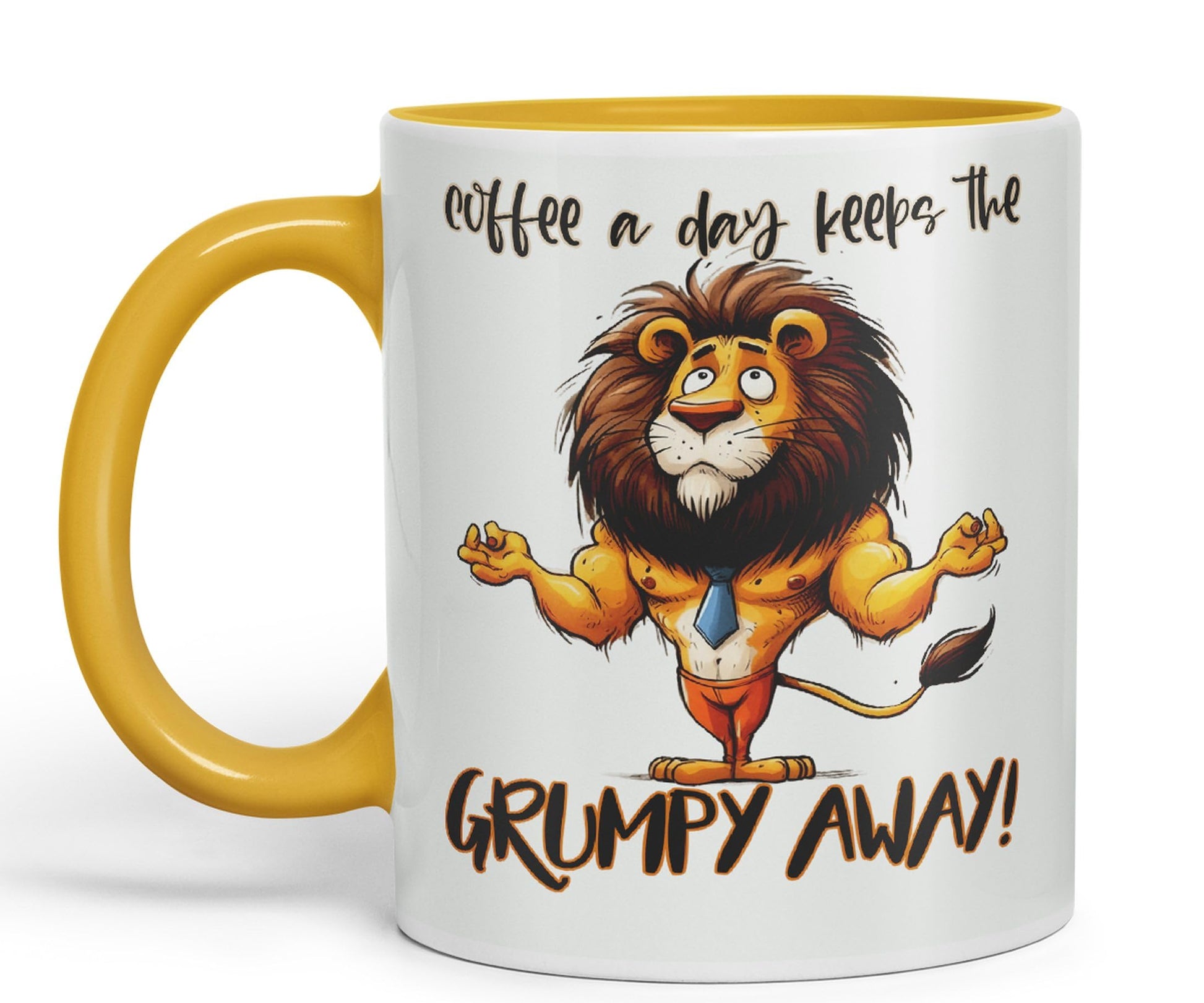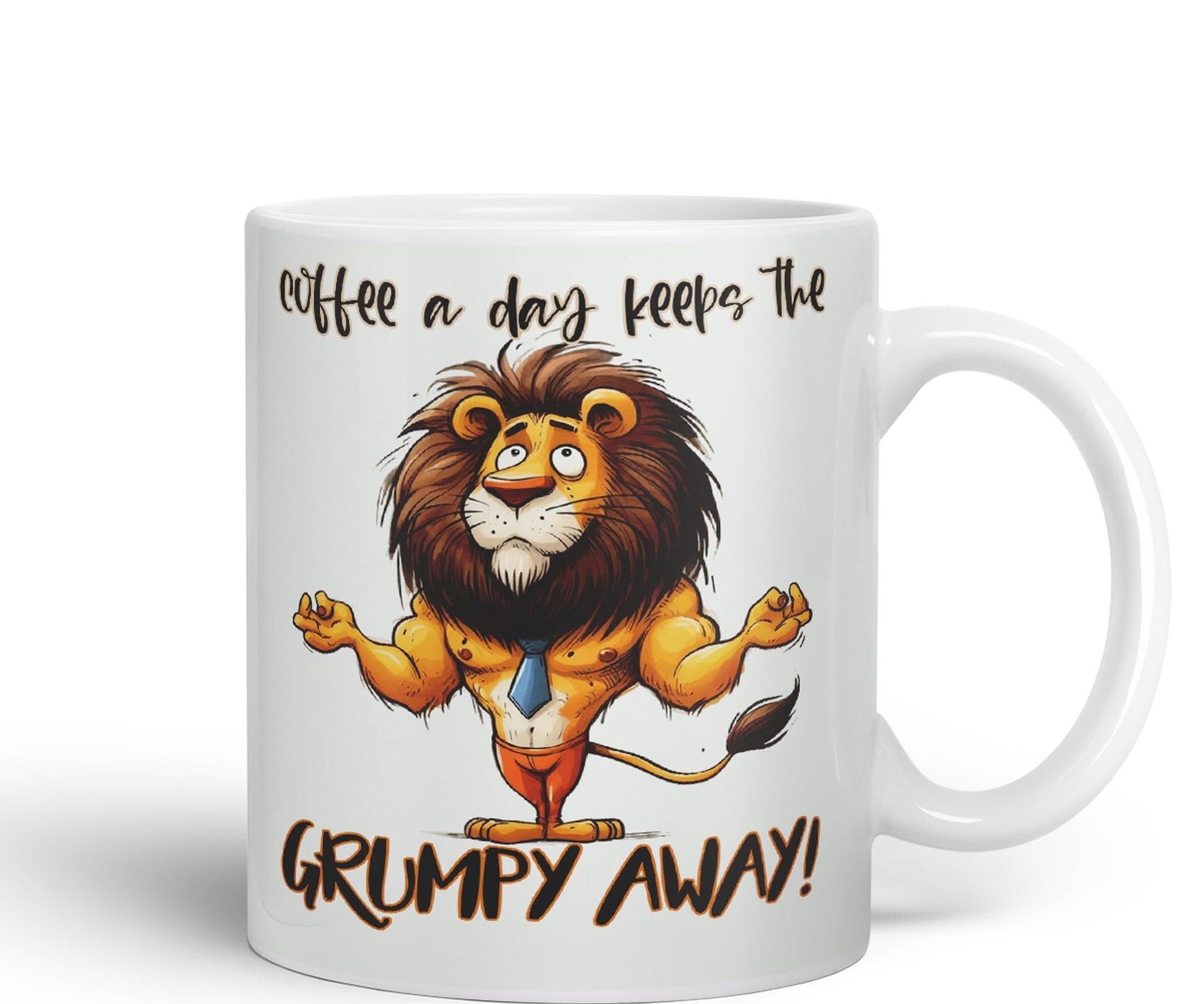 Coffee a Day Keeps The Grumy Away! Lion Joke sarkasm Sarcastic Ceramic Coloured Mug Cup for Tea Coffee Hot Brew 330ml 11Oz Gift