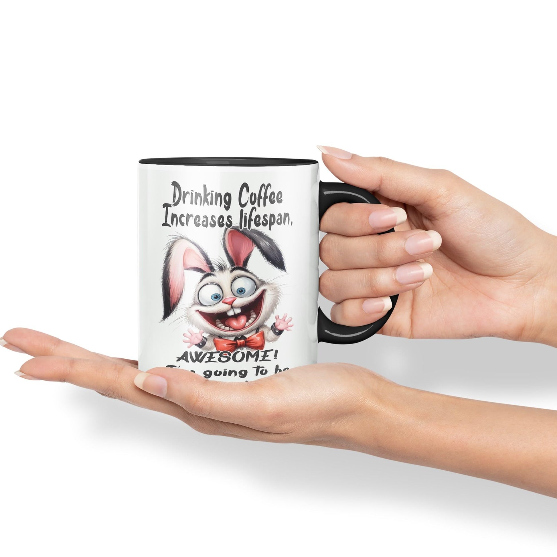Drinking Coffee Increases lifespan Awesome! I'm going to be immortal, Rabbit hare joke sarkasm sarcastic Ceramic Coloured Mug Cup for Tea Coffee Hot brew 330ml 11Oz Gift (Black)