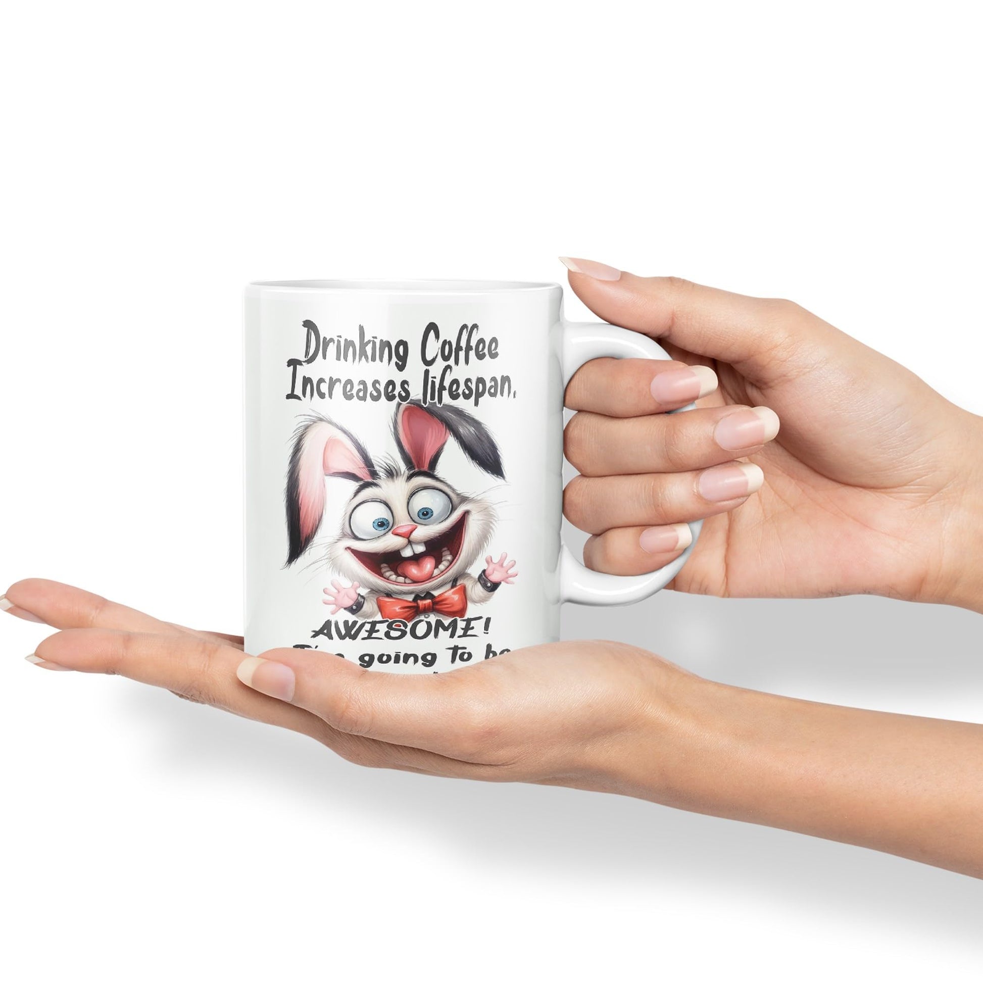 Drinking Coffee Increases lifespan Awesome! I'm Going to be Immortal, Rabbit Hare Joke sarkasm Sarcastic Ceramic Coloured Mug Cup for Tea Coffee Hot Brew 330ml 11Oz Gift