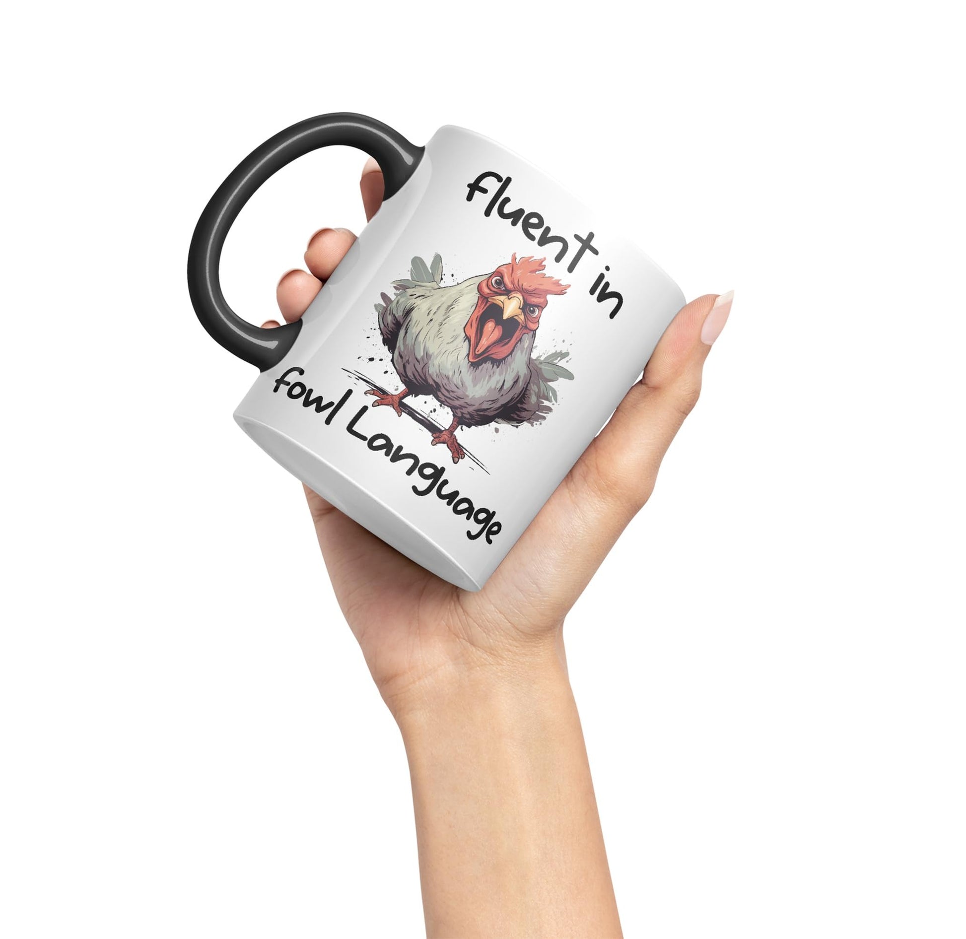 Fluent in fowl Language Rooster cockerel joke sarkasm sarcastic Ceramic Coloured Mug Cup for Tea Coffee Hot brew 330ml 11Oz Gift (Black)