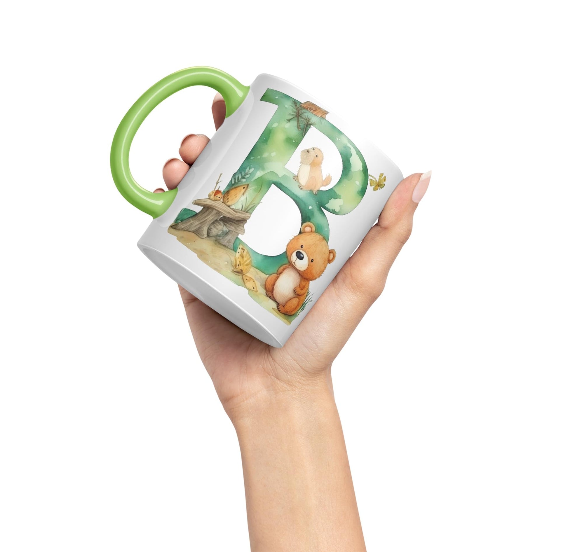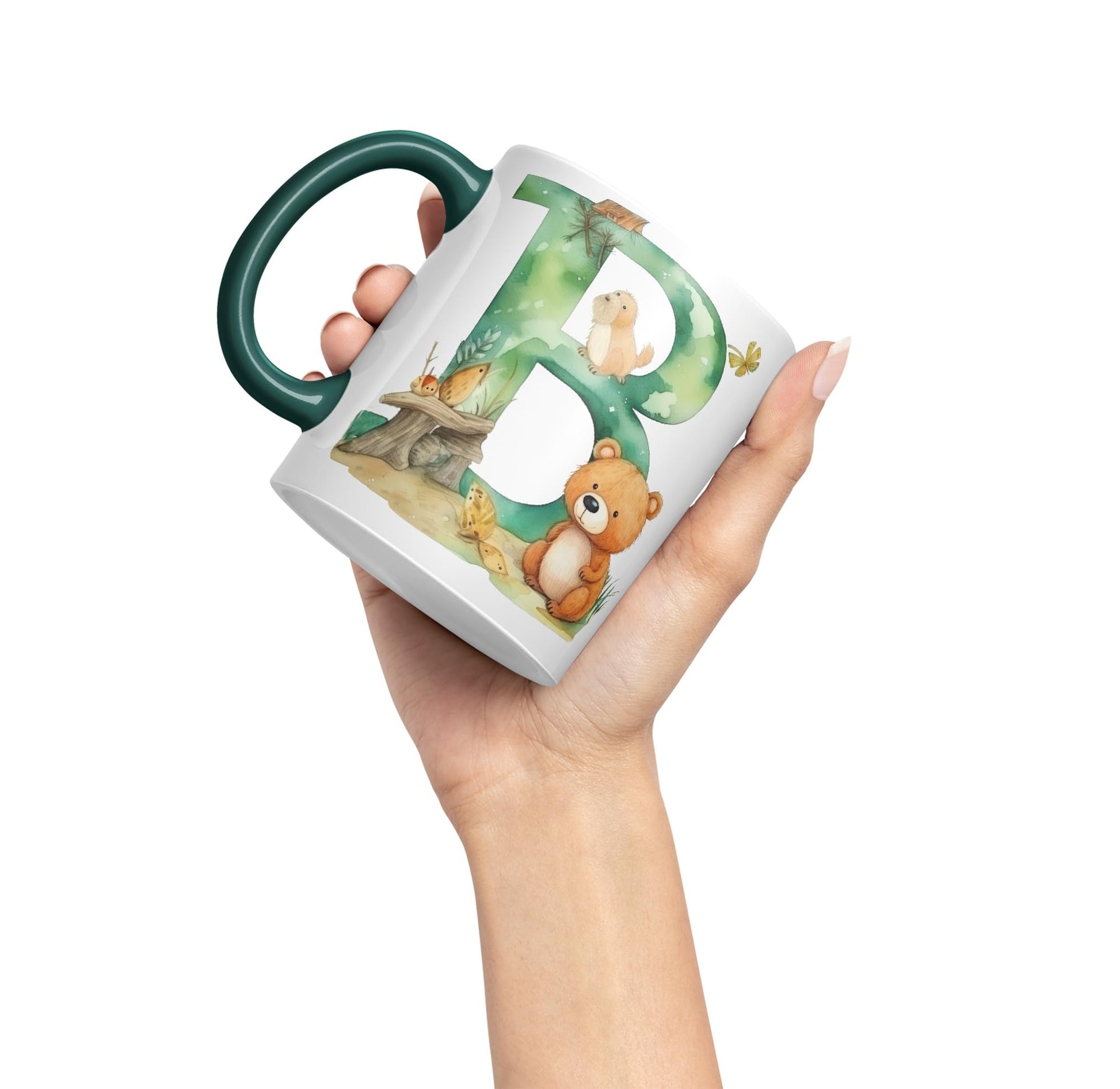 Letter B mug, Animals Alphabet Letter B Monogram animal for kids Ceramic Coloured Mug Cup for Tea Coffee Hot brew 330ml 11Oz Gift (D Green)