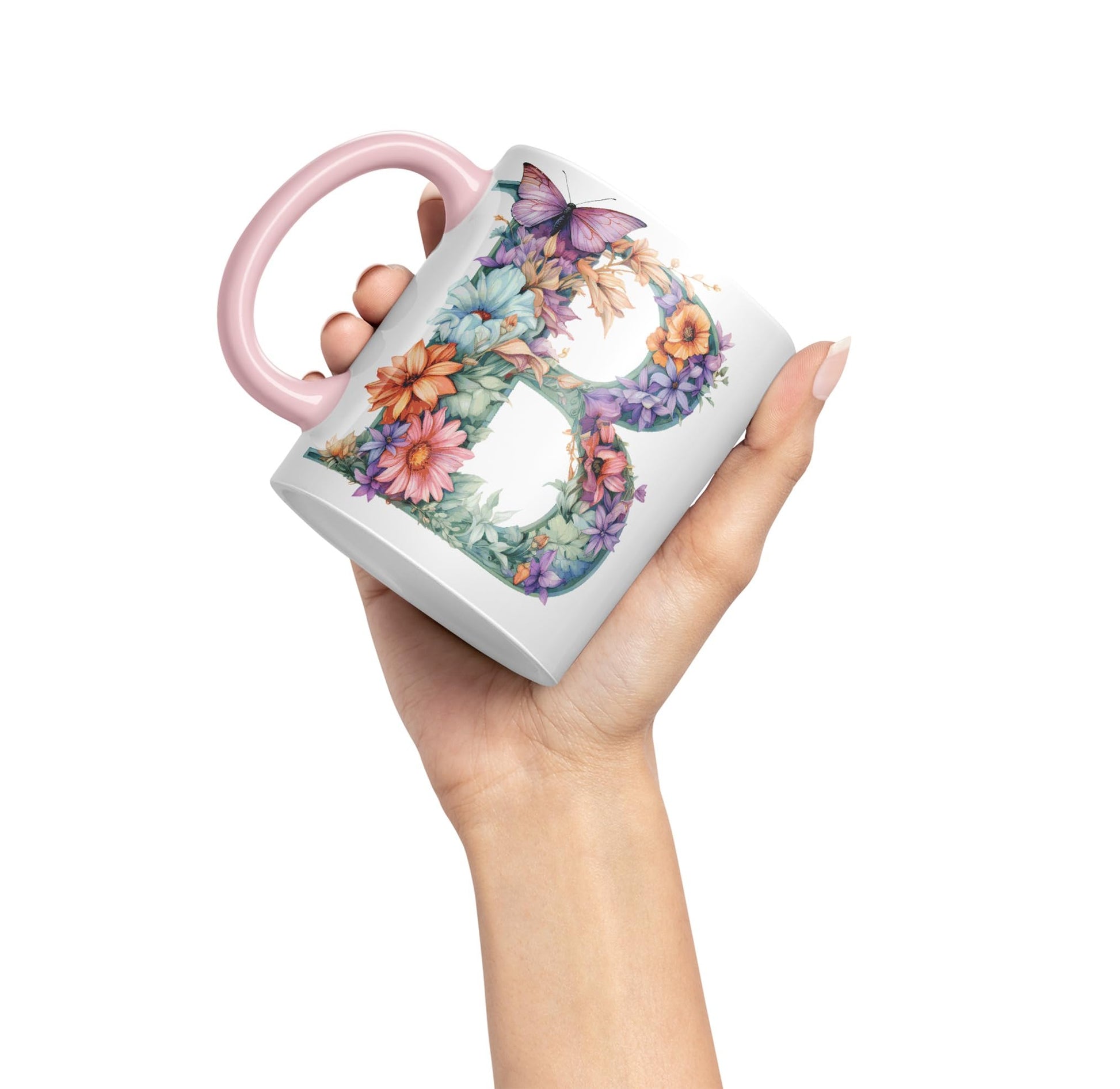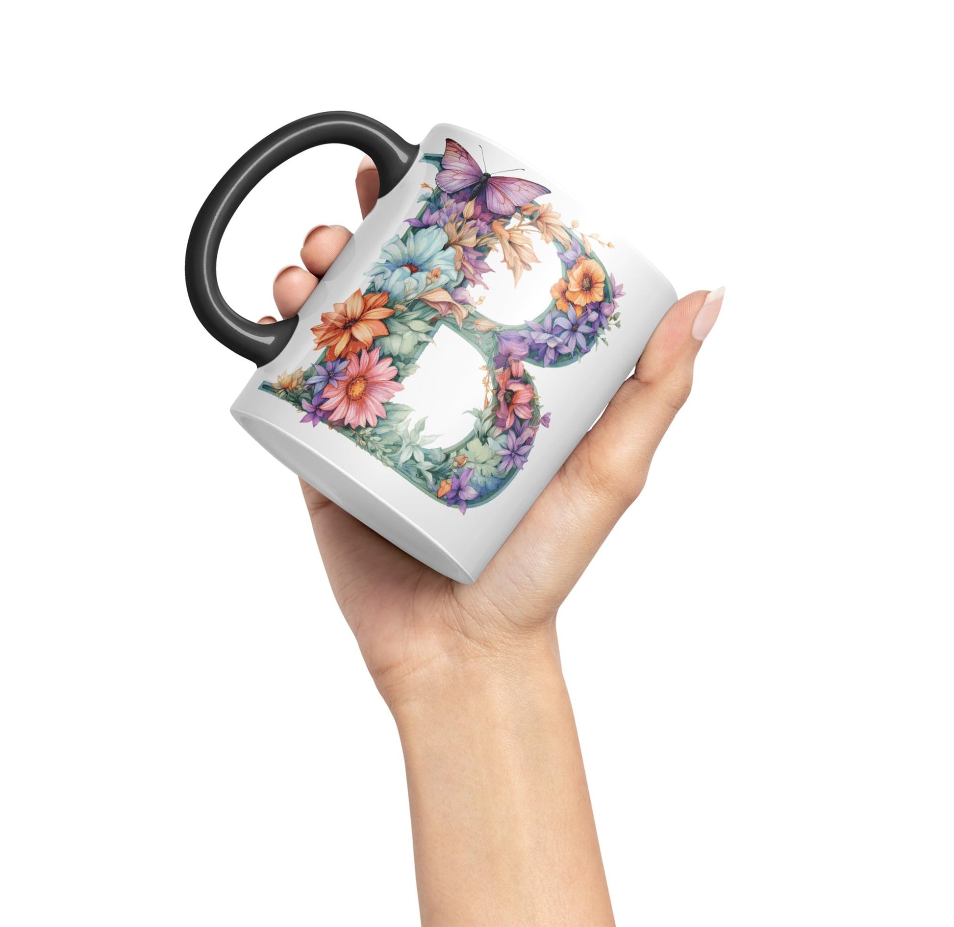 Letter B mug, Floral flowers butterfly Alphabet Letter B Monogram watercolour Ceramic Coloured Mug Cup for Tea Coffee Hot brew 330ml 11Oz Gift