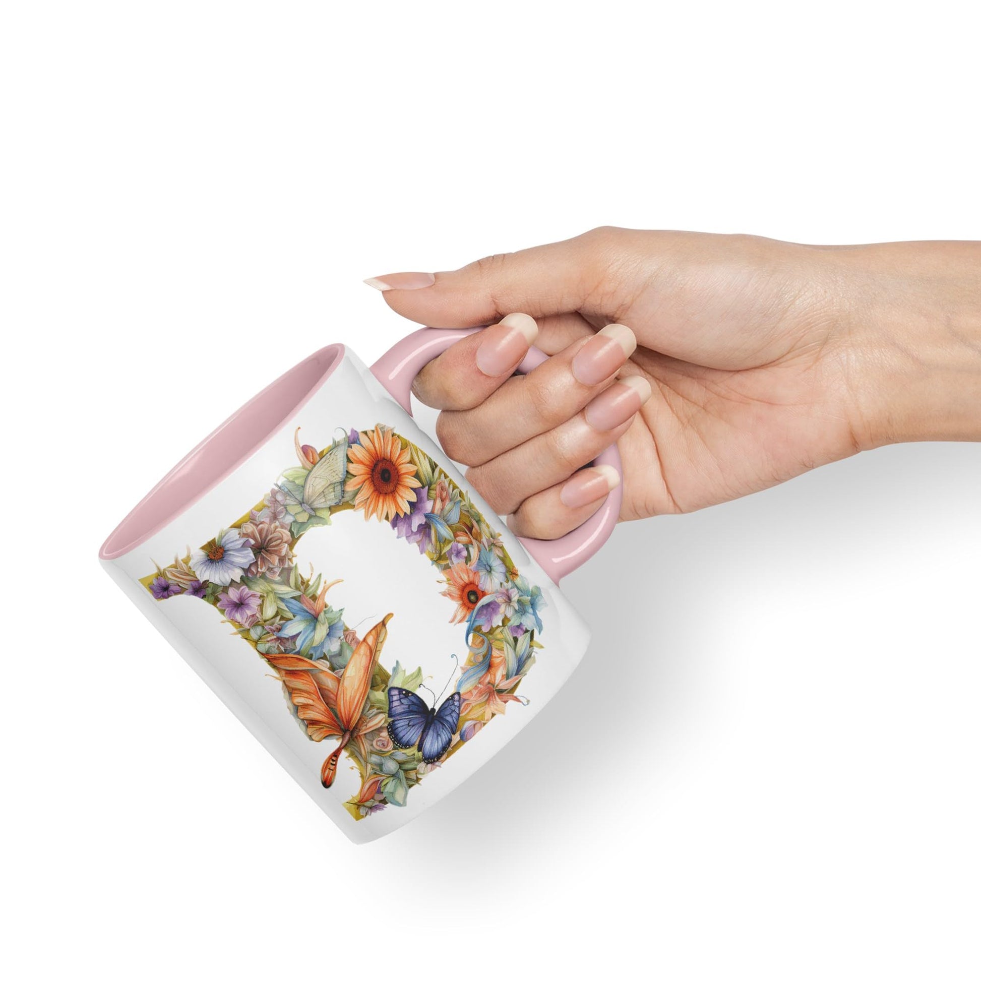 Letter D mug, Floral flowers butterfly Alphabet Letter D Monogram watercolour Ceramic Coloured Mug Cup for Tea Coffee Hot brew 330ml 11Oz Gift