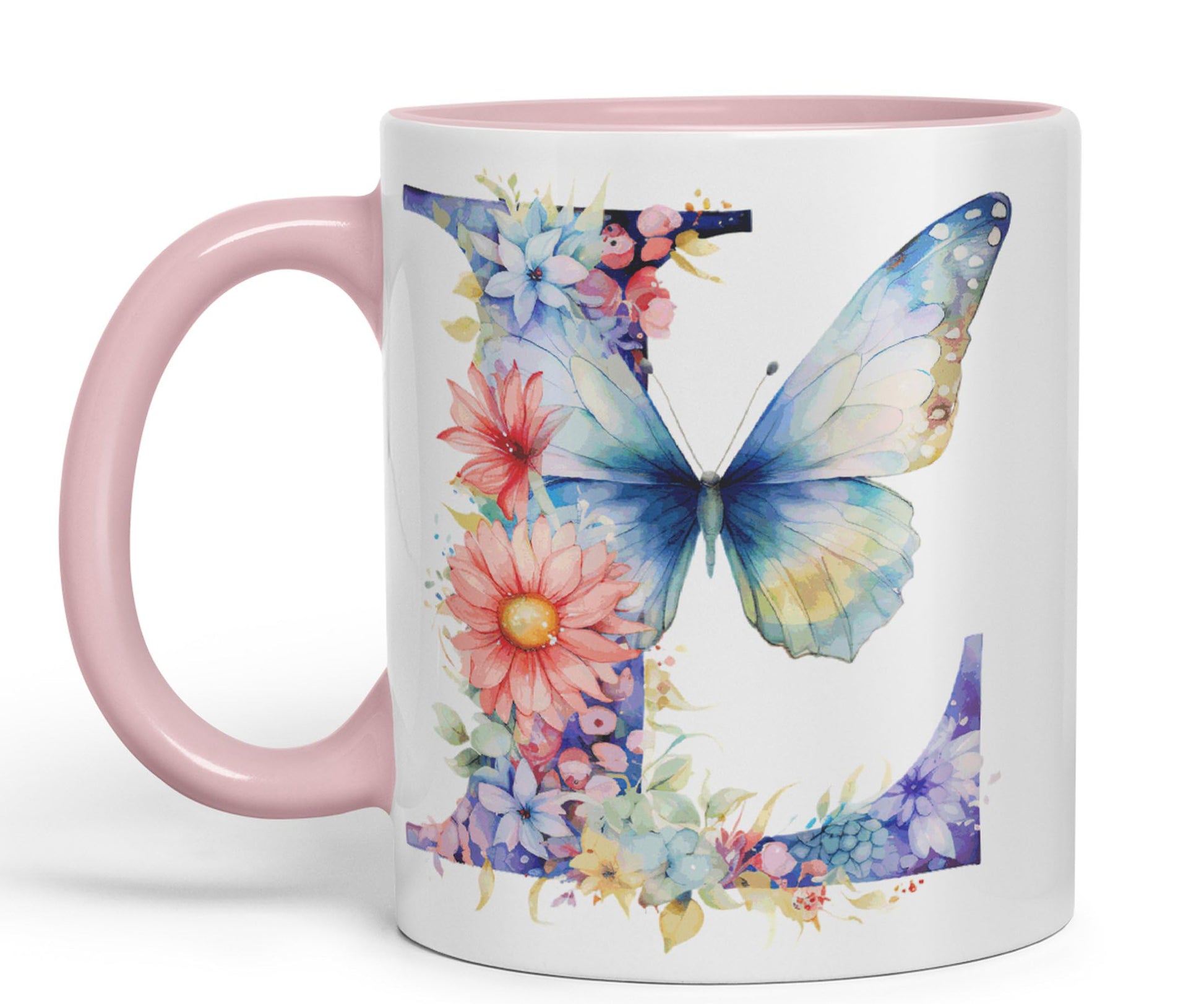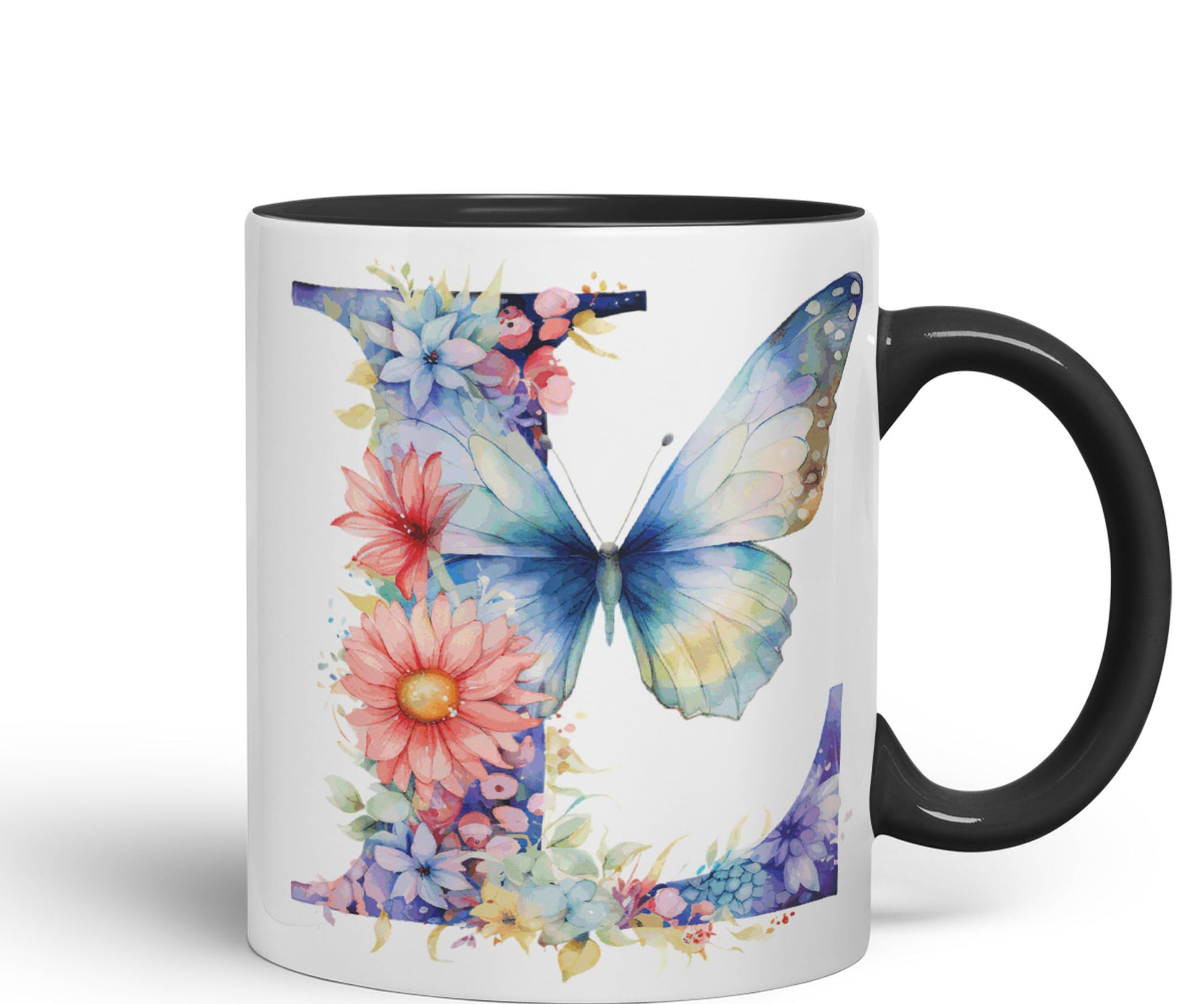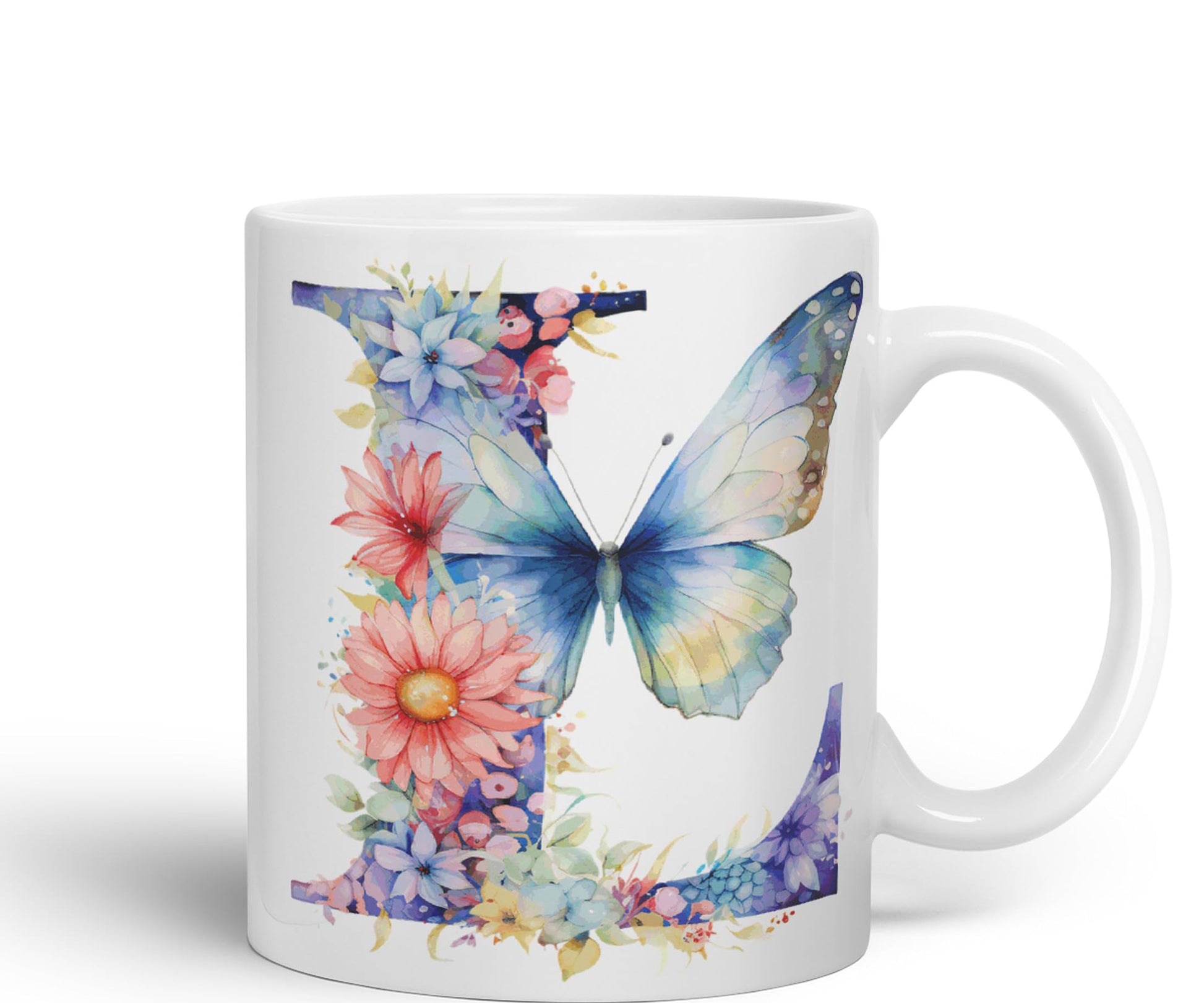 Letter L mug, Floral flowers butterfly Alphabet Letter L Monogram watercolour Ceramic Coloured Mug Cup for Tea Coffee Hot brew 330ml 11Oz Gift