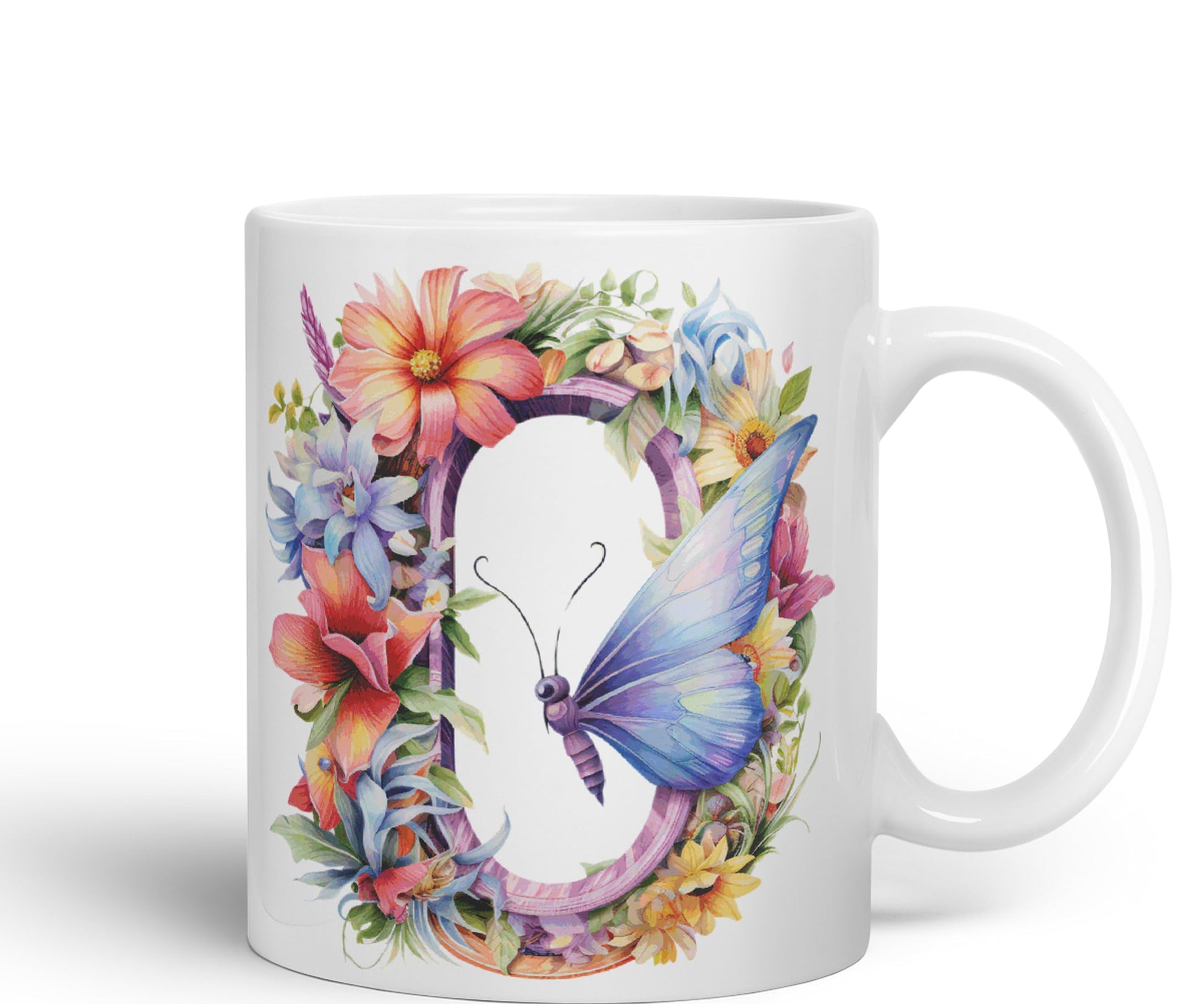 Letter O mug, Floral flowers butterfly Alphabet Letter O Monogram watercolour Ceramic Coloured Mug Cup for Tea Coffee Hot brew 330ml 11Oz Gift