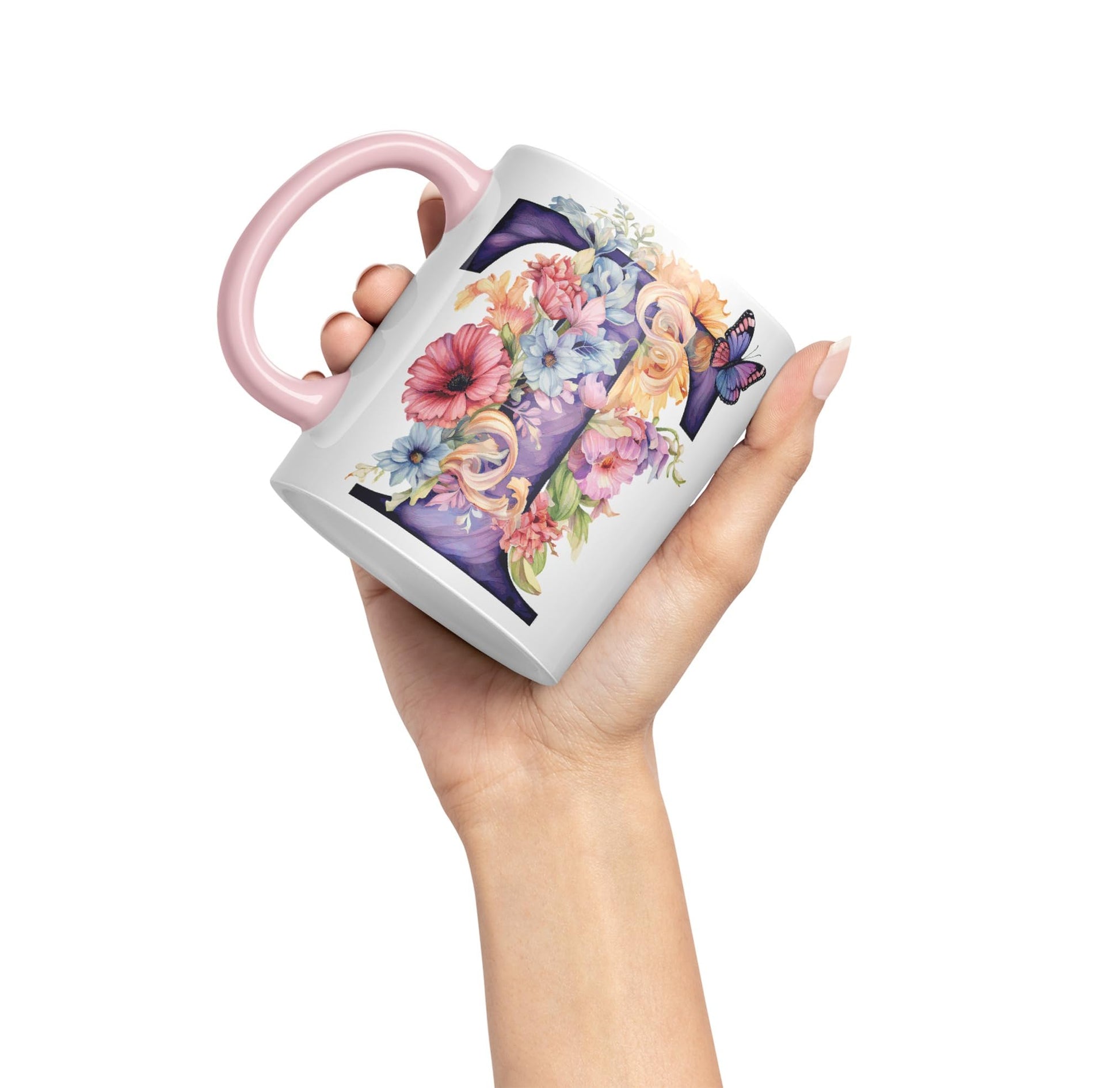 Letter T mug, Floral flowers butterfly Alphabet Letter T Monogram watercolour Ceramic Coloured Mug Cup for Tea Coffee Hot brew 330ml 11Oz Gift