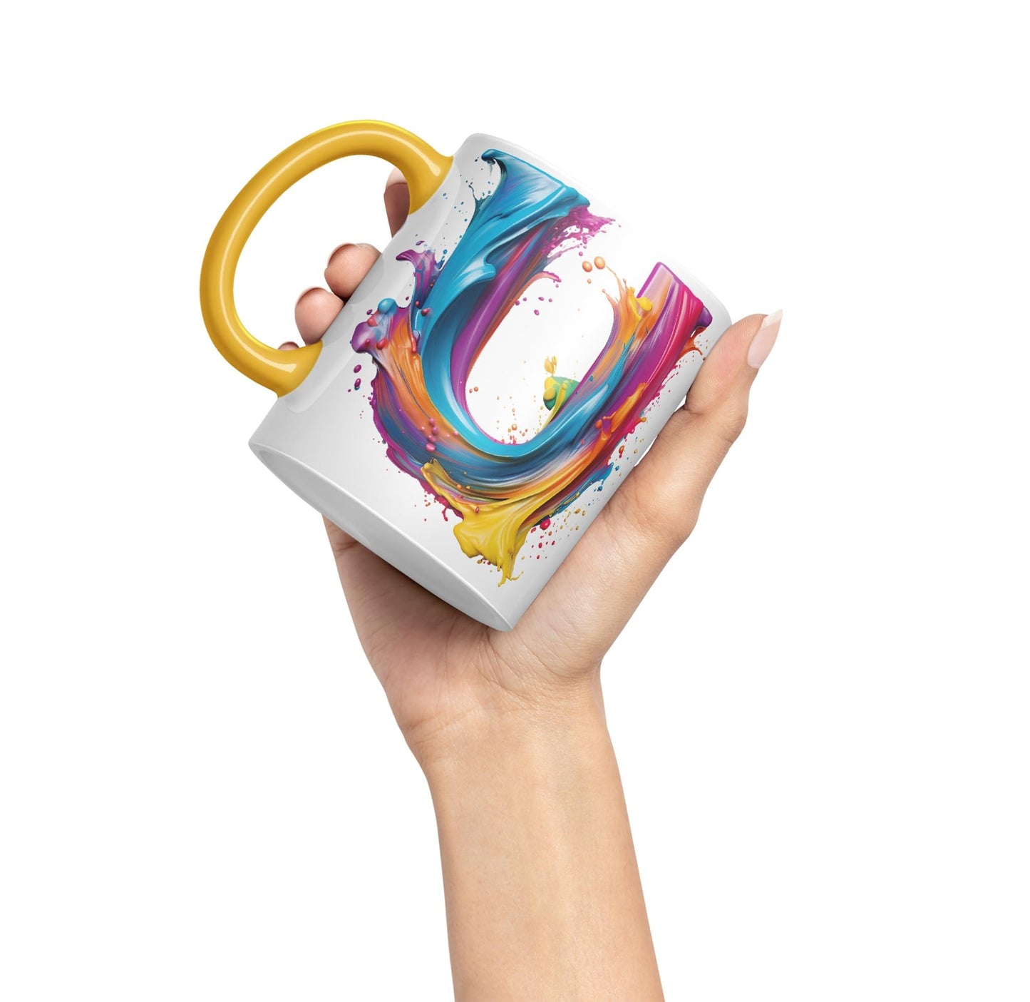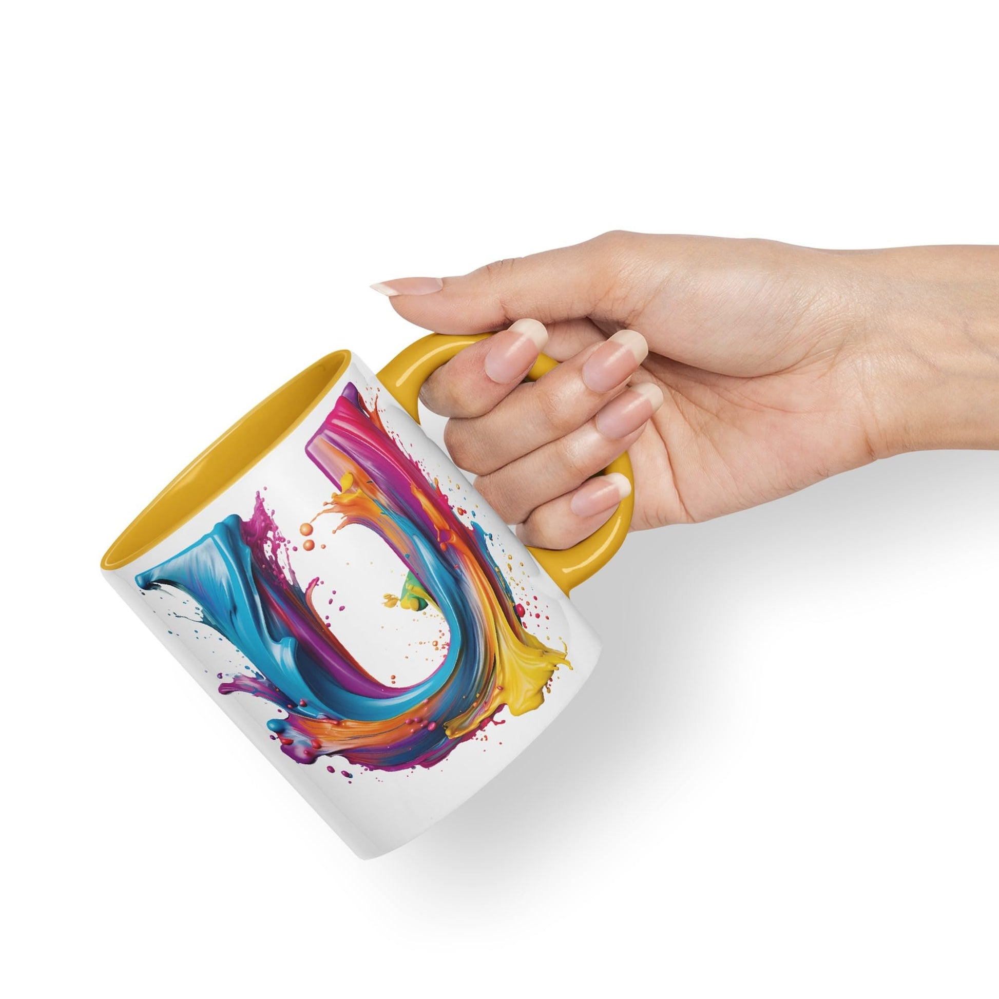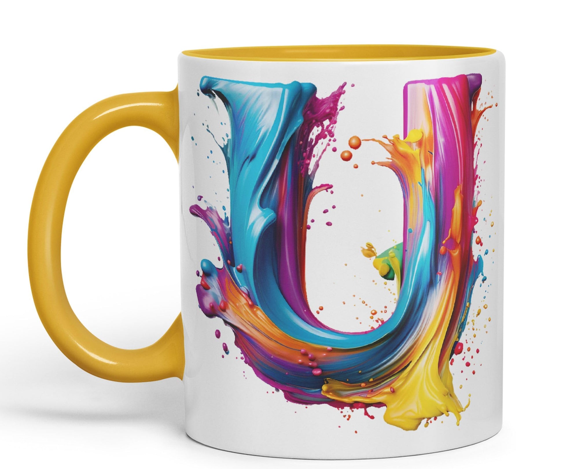 Letter U mug, Alphabet Letter U Monogram watercolour Ceramic Coloured Mug Cup for Tea Coffee Hot brew 330ml 11Oz Gift (G yellow)