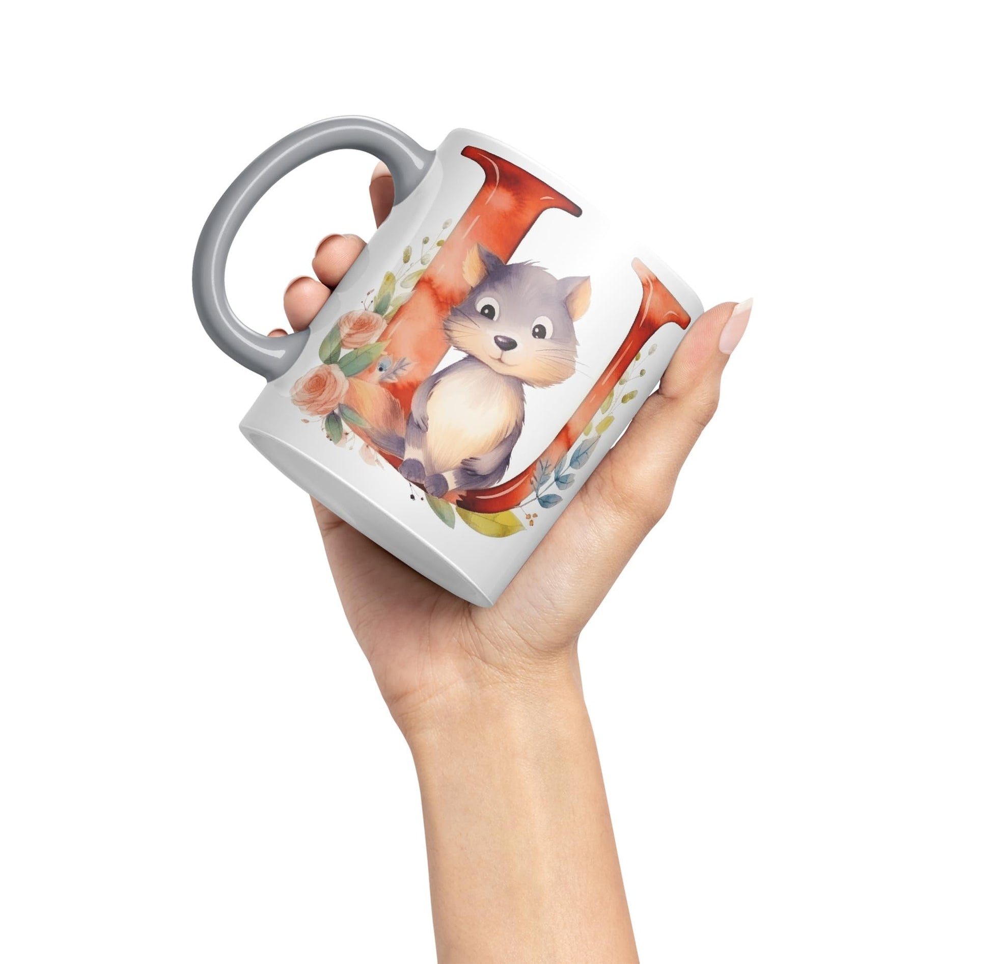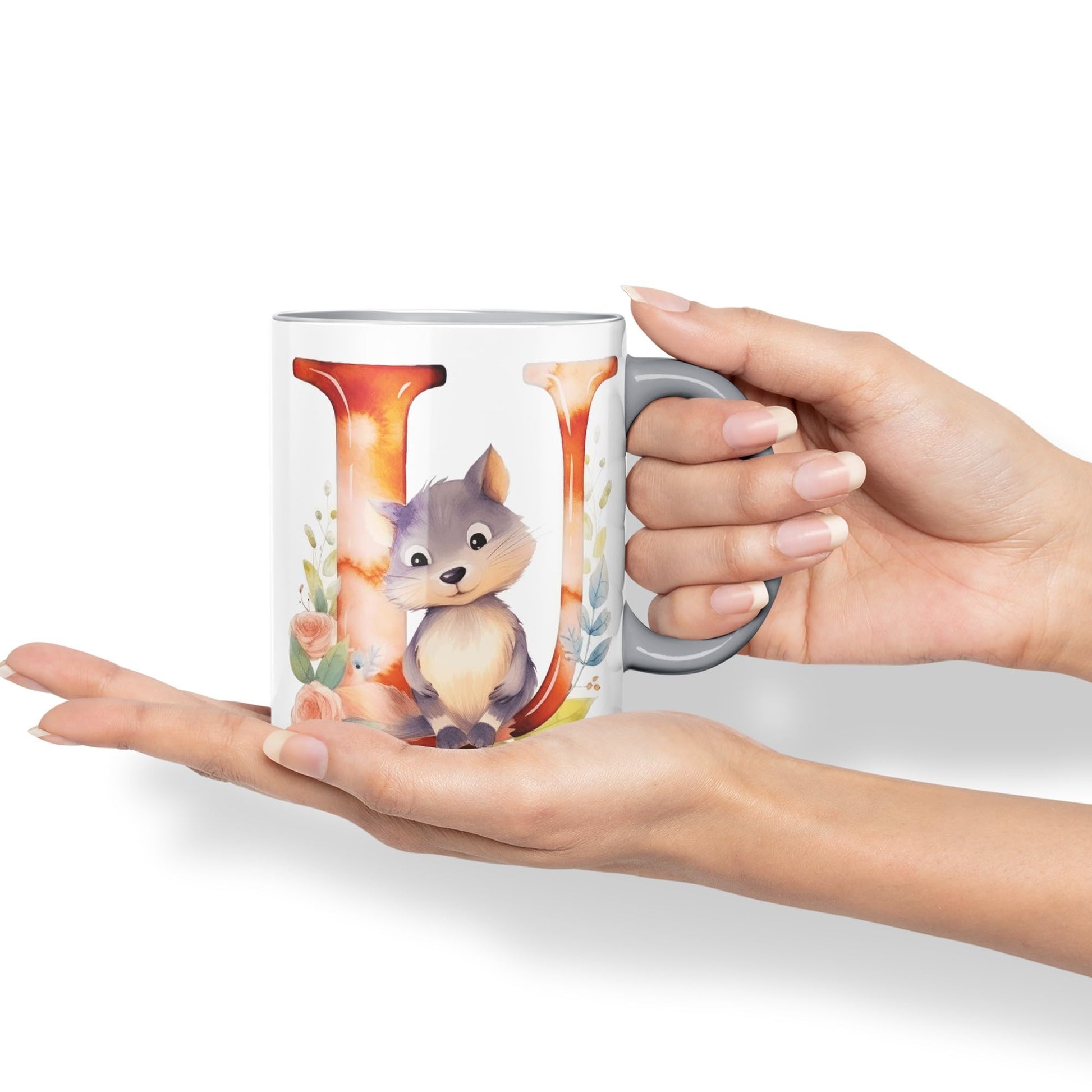 Letter U mug, Animals Alphabet Letter U Monogram animal for kids Ceramic Coloured Mug Cup for Tea Coffee Hot brew 330ml 11Oz Gift (grey)