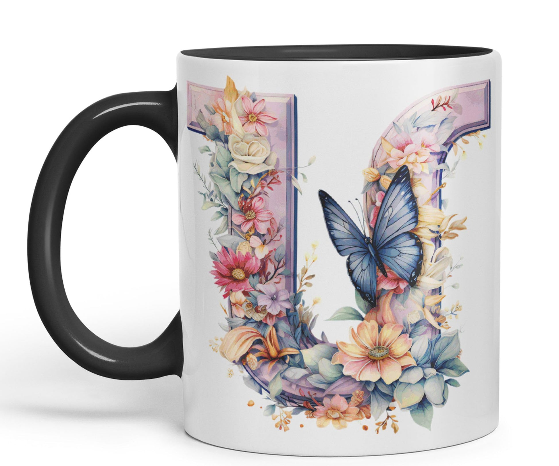 Letter U mug, Floral flowers butterfly Alphabet Letter U Monogram watercolour Ceramic Coloured Mug Cup for Tea Coffee Hot brew 330ml 11Oz Gift (Black)