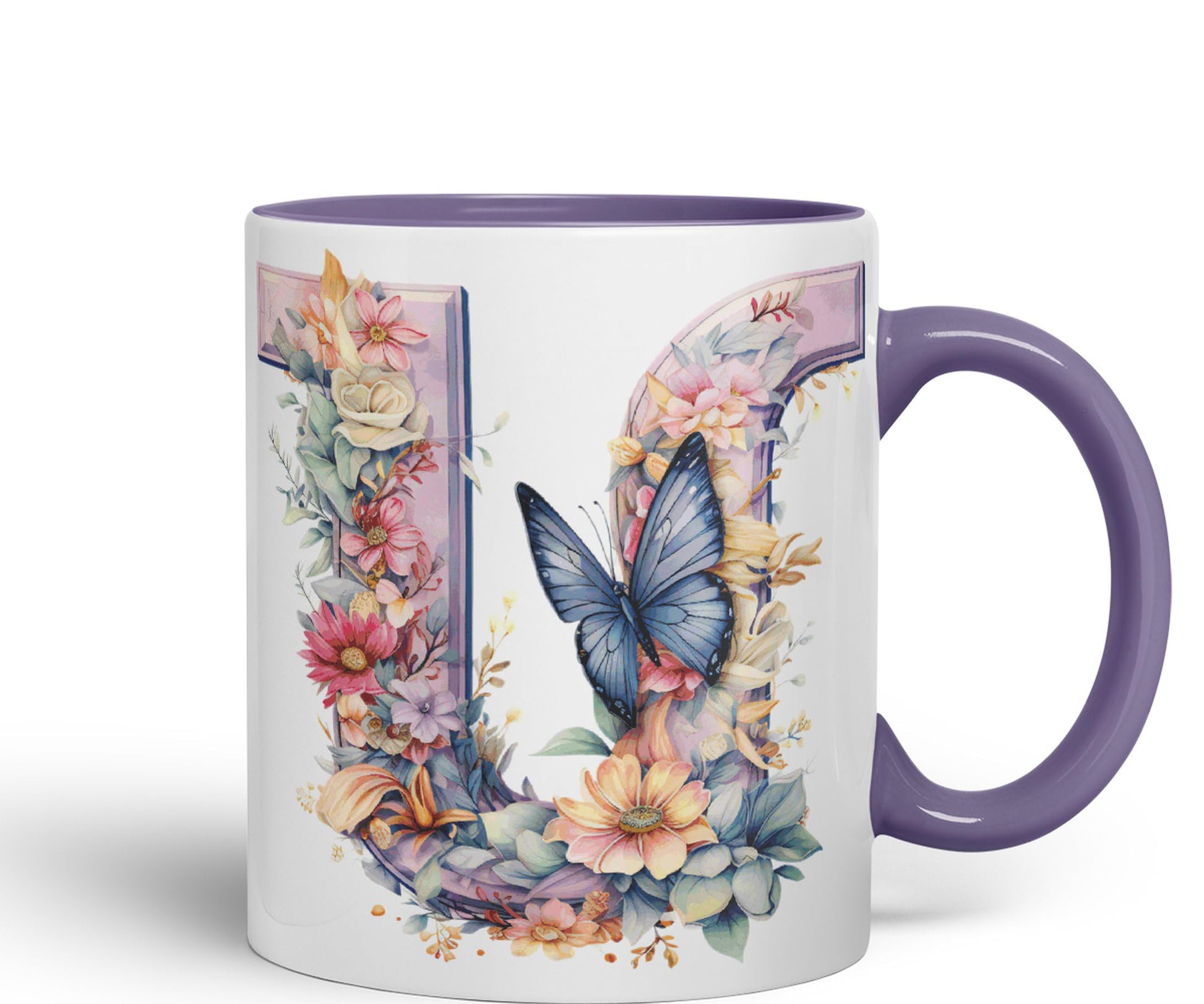 Letter U mug, Floral flowers butterfly Alphabet Letter U Monogram watercolour Ceramic Coloured Mug Cup for Tea Coffee Hot brew 330ml 11Oz Gift