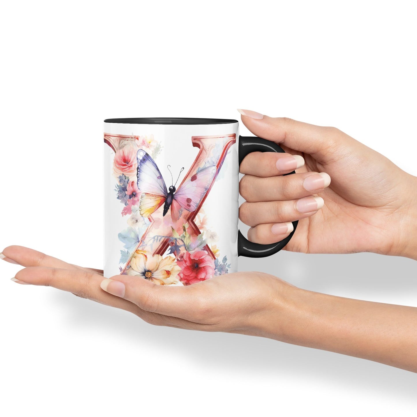 Letter X mug, Floral flowers butterfly Alphabet Letter X Monogram watercolour Ceramic Coloured Mug Cup for Tea Coffee Hot brew 330ml 11Oz Gift