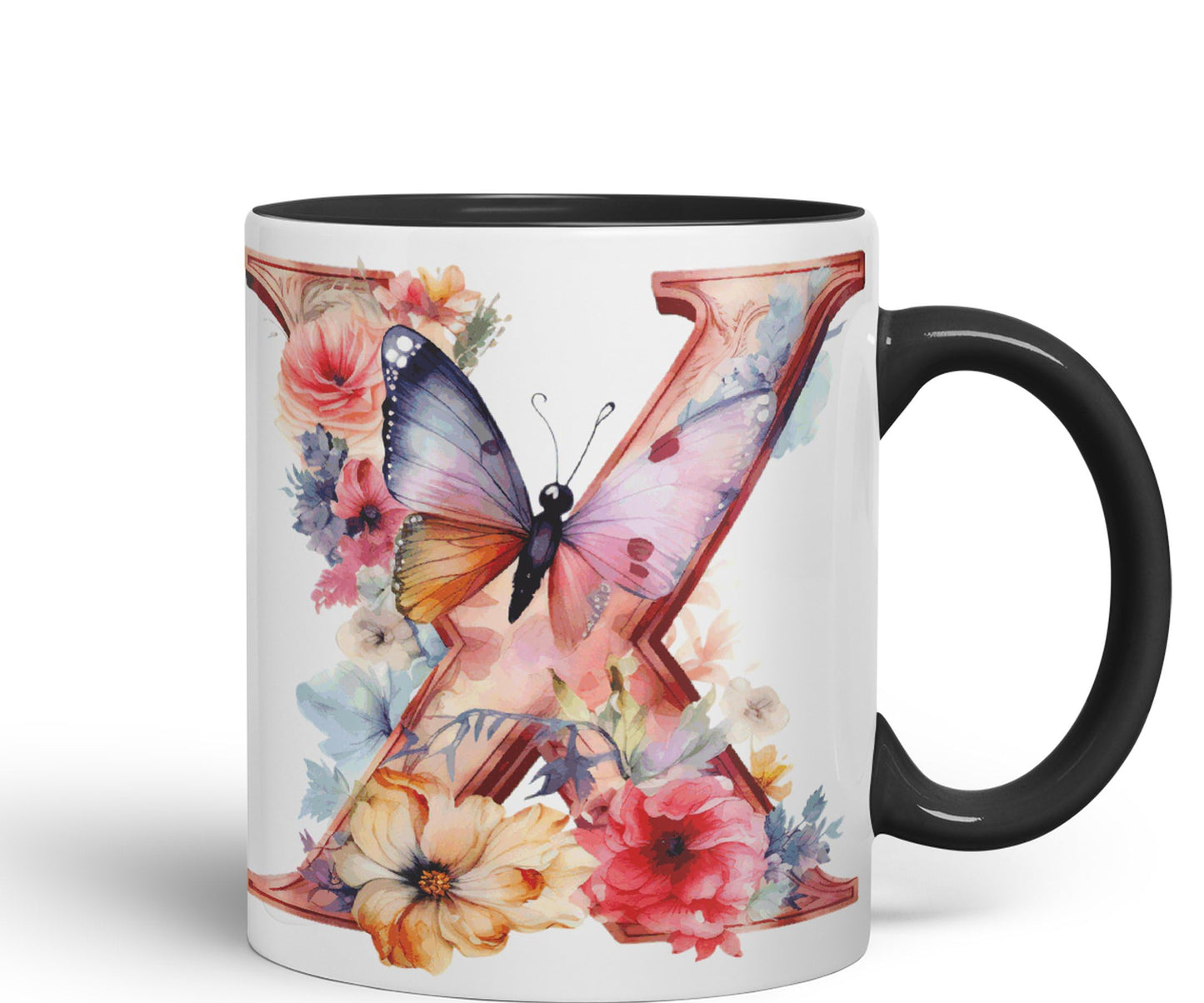 Letter X mug, Floral flowers butterfly Alphabet Letter X Monogram watercolour Ceramic Coloured Mug Cup for Tea Coffee Hot brew 330ml 11Oz Gift (Black)