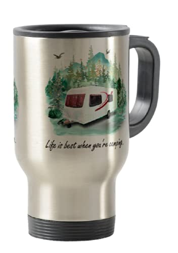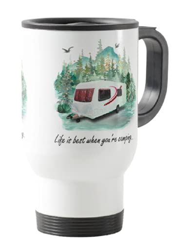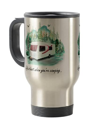 Travel Mug, Camping, Caravan Life is Best When You're Camping, Holiday, Cup Novelty Office Birthday Christmas Coffee Gift Tea Present White or Silver