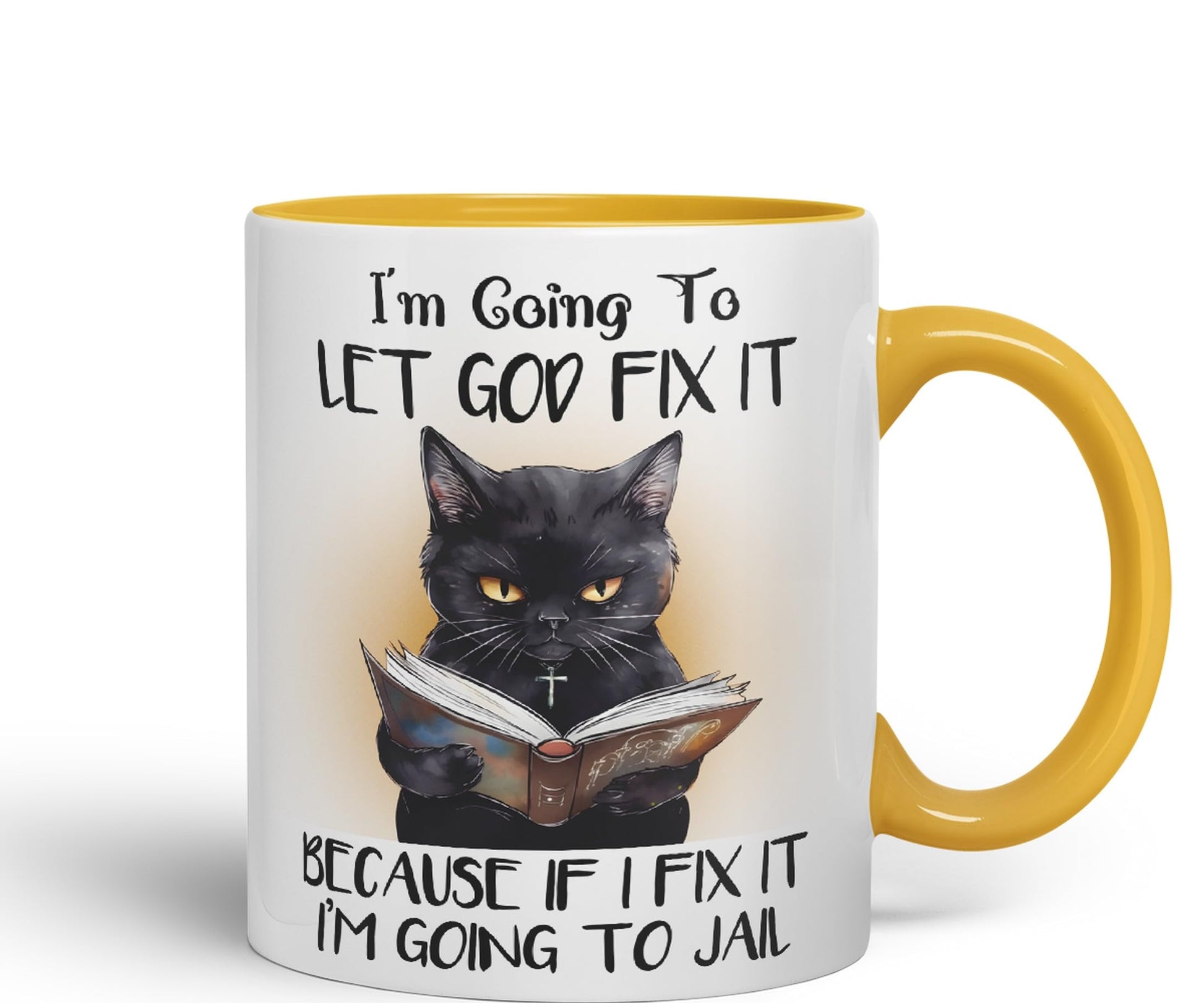I'm Going To LET GOD FIX IT, Because if I fix it I;m going to Jail, cats Sarcastic Joke Ceramic Coloured Mug Cup for Tea Coffee Hot brew 330ml 11Oz