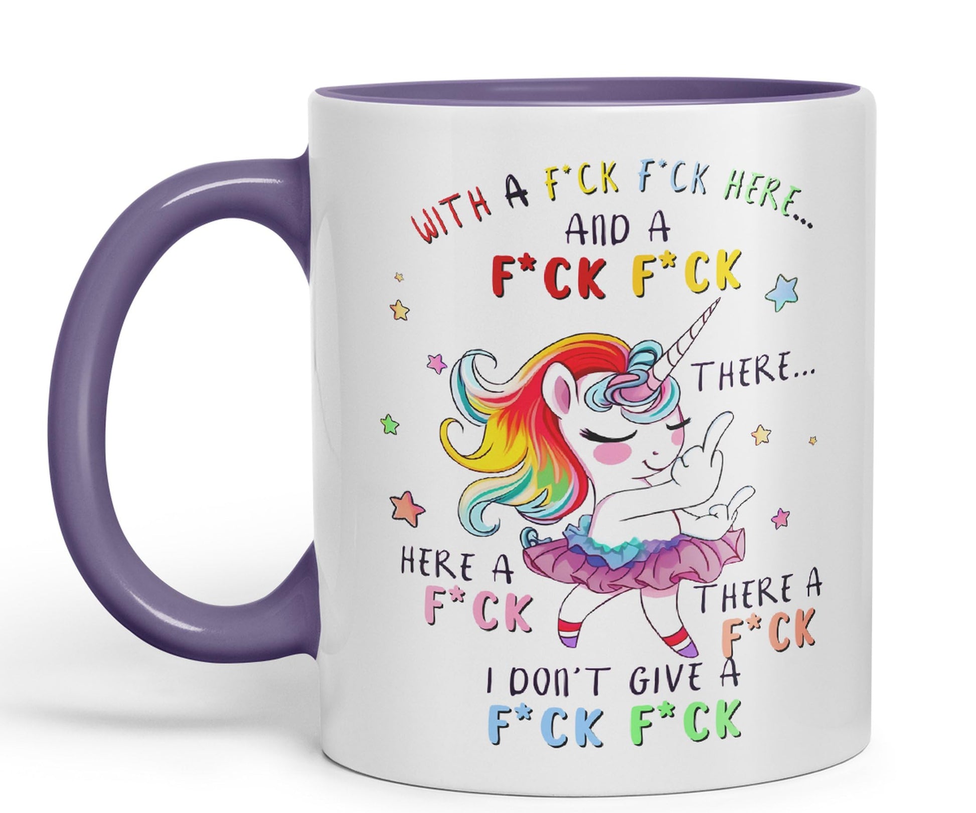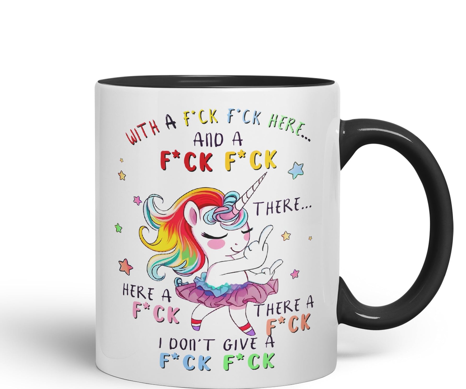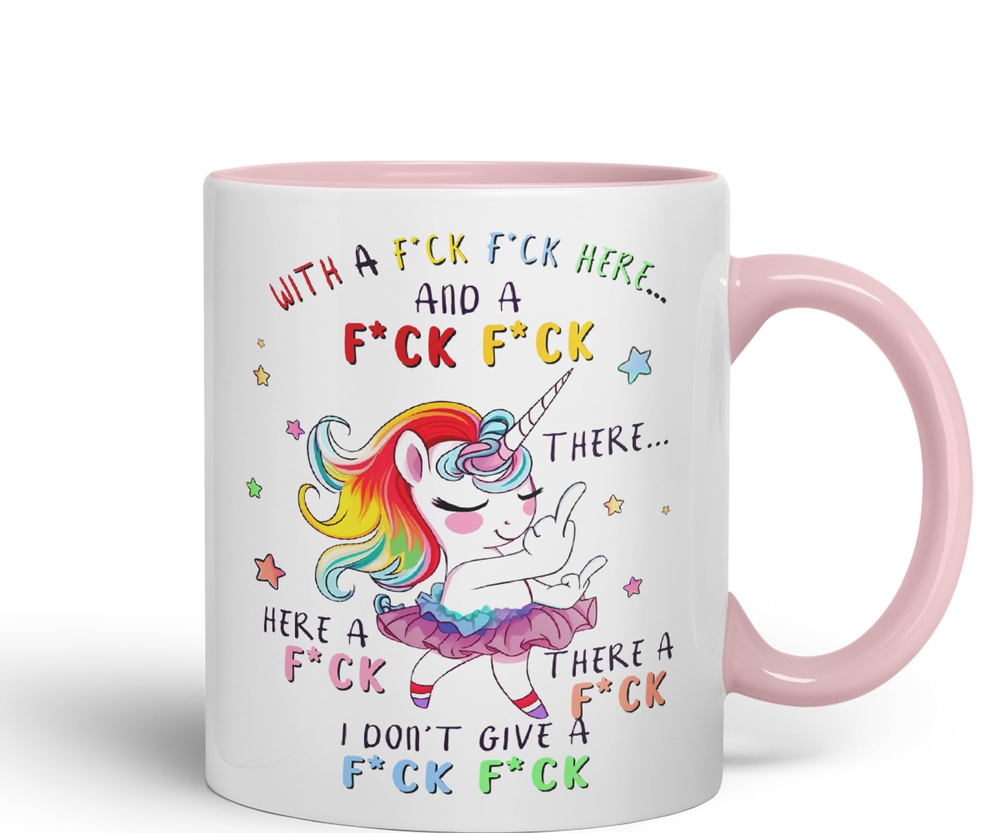 with a f.ck here and… There. I Don't Give a f.ck Unicorn Joke sarkasm Sarcastic Ceramic Coloured Mug Cup for Tea Coffee Hot Brew 330ml 11Oz Gift